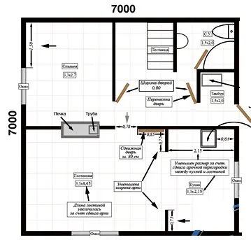 Вариантов планировки коттеджей 6 на 6, 6 на 7 или 6 на 8 с печным оборудованием много. Чертежи могут меняться в зависимости от потребностей хозяев жилья.