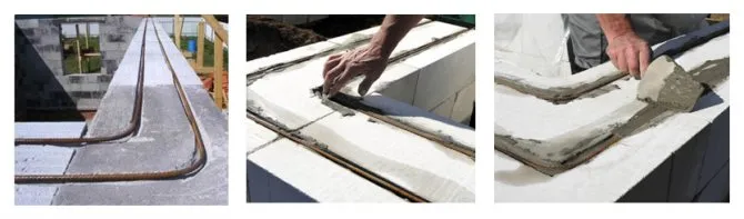 Значение марки прочности газосиликатного блока с плотностью 500 кг/м 3 , у разных производителей, колеблется в пределах от М35 до М50. Как следствие, согласно инструкции производителей газосиликатных блоков каждый третий ряд кладки следует армировать, как показано на фото ниже.